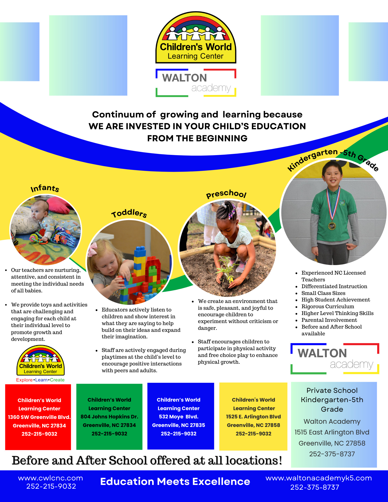 Our model is unparalleled in our community. Children’s World Learning Center currently operates four childcare centers in the Greenville/Pitt County area and is still growing. Children coming through our childcare centers are equipped with the skills needed to make a smooth transition into our kindergarten at Walton Academy. This progression is effortless for all involved because the students and families are already part of our community.